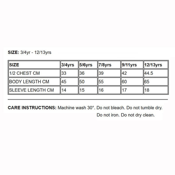 | SIZE | 3/4yrs | 5/6yrs | 7/8yrs | 9/11yrs | 12/13yrs |